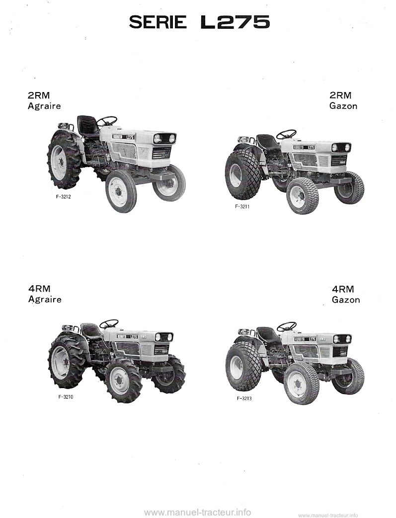 Description : Ce manuel de l'utilisateur pour les tracteurs Kubota modèle L275, 2 et 4 roues motrices, agraire et gazon. Il comporte 42 pages écrite en français avec de nombreux schémas.