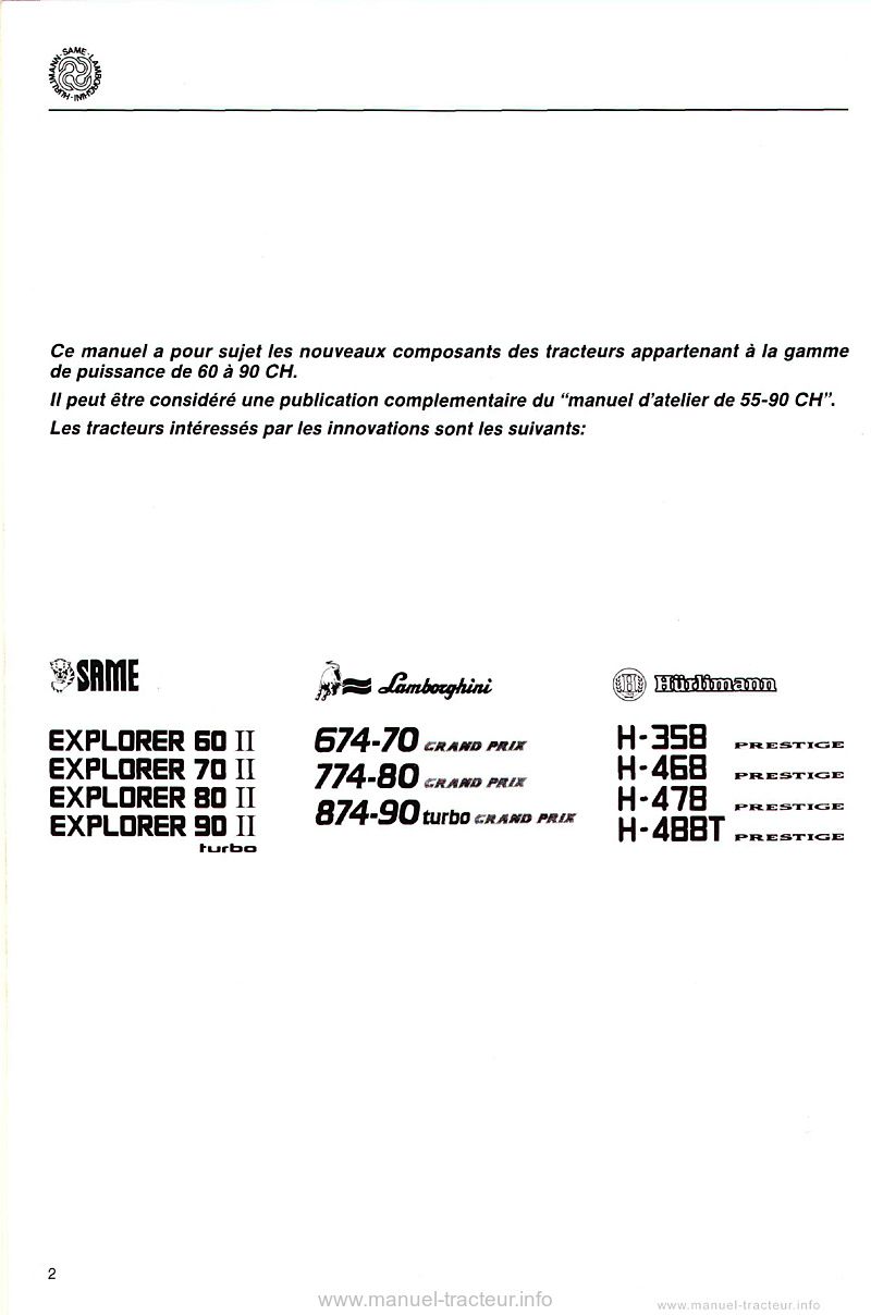Ce manuel est aussi adapté pour les tracteurs suivants : Lamborghini 674-70, 774-80, 874-90 turbo Grand Prix - Hürlimann H358, H468, H478 et H488T Prestige.